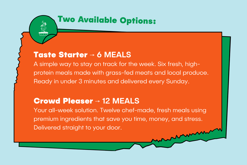 We make eating well easy for busy people. Every meal is cooked fresh with local produce, grass-fed meats, and ingredients you can actually pronounce. No preservatives, no shortcuts. just real food that fits your week.
