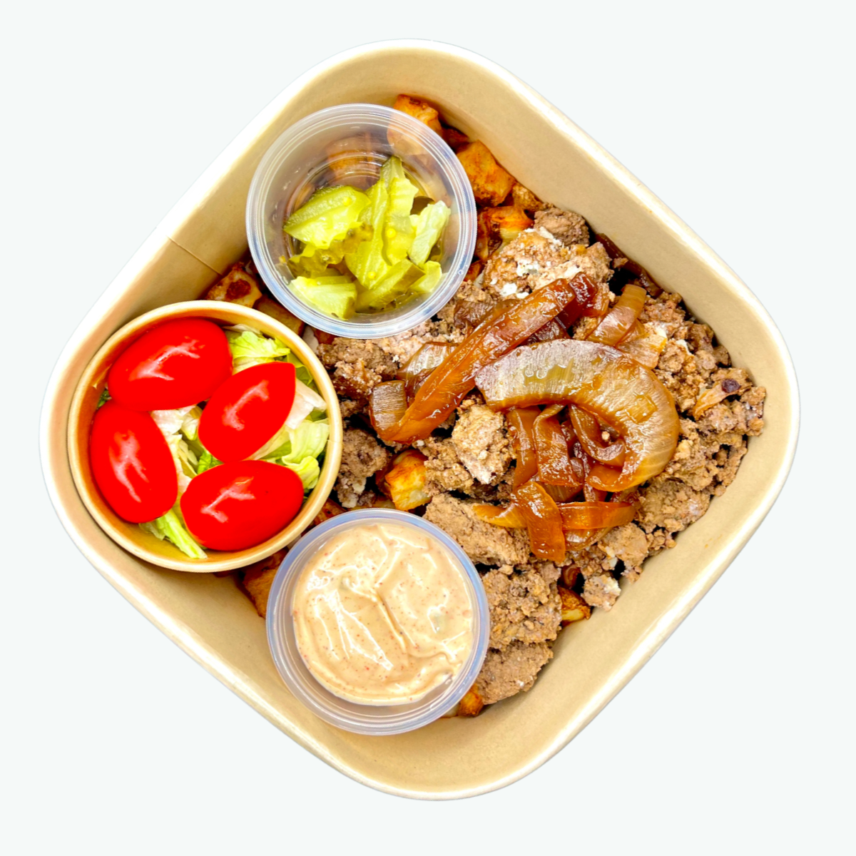Experience all the flavors of a classic burger—crispy oven-baked potatoes, juicy grass-fed beef, grilled onions, fresh lettuce, tomatoes, pickles—topped with our mouthwatering homemade not so secret sauce, all in one convenient bowl.