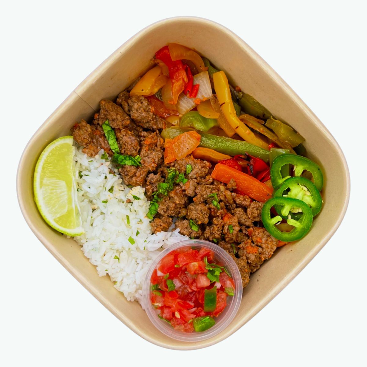 Fiesta Beef Bowl with our high-quality, grass-fed ground beef, seasoned to perfection. Paired with jasmine cilantro lime rice for a refreshing twist, and topped with a smoky, fire-roasted fajita pepper mix