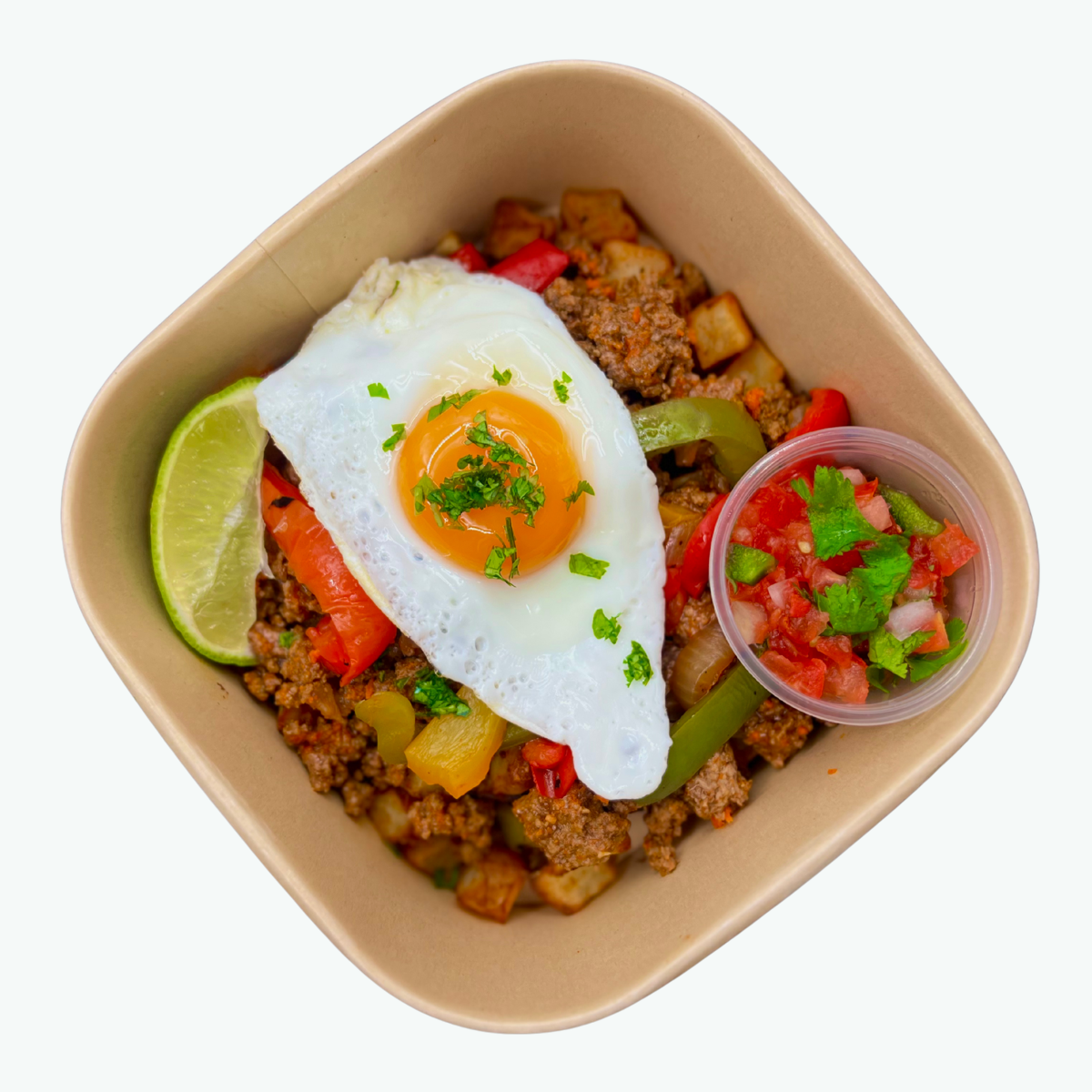 Kickstart your morning with our Fiesta Breakfast Bowl—a zesty mix of crispy oven-baked potatoes, seasoned grass-fed beef, vibrant fajita vegetables, fresh pico, and a sunny side up egg for a burst of flavour in every bite.