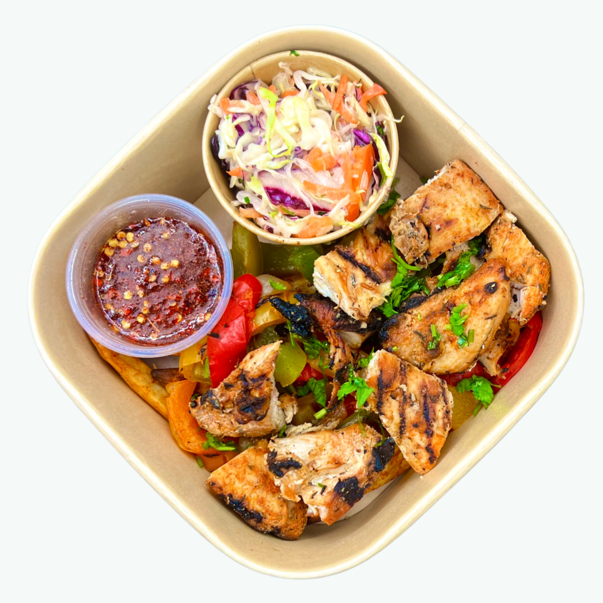 Our Hot Honey Chicken Bowl delivers the perfect mix of bold and balanced flavors. Juicy Cajun-spiced chicken breast is glazed with a touch of honey for that irresistible sweet-heat finish. Roasted sweet potatoes and sautéed bell peppers bring a wholesome, colorful base, while coleslaw and fresh cilantro ties it all together. Packed with lean protein and nutrient-rich carbs, this bowl fuels your body and satisfies your cravings in one bite.