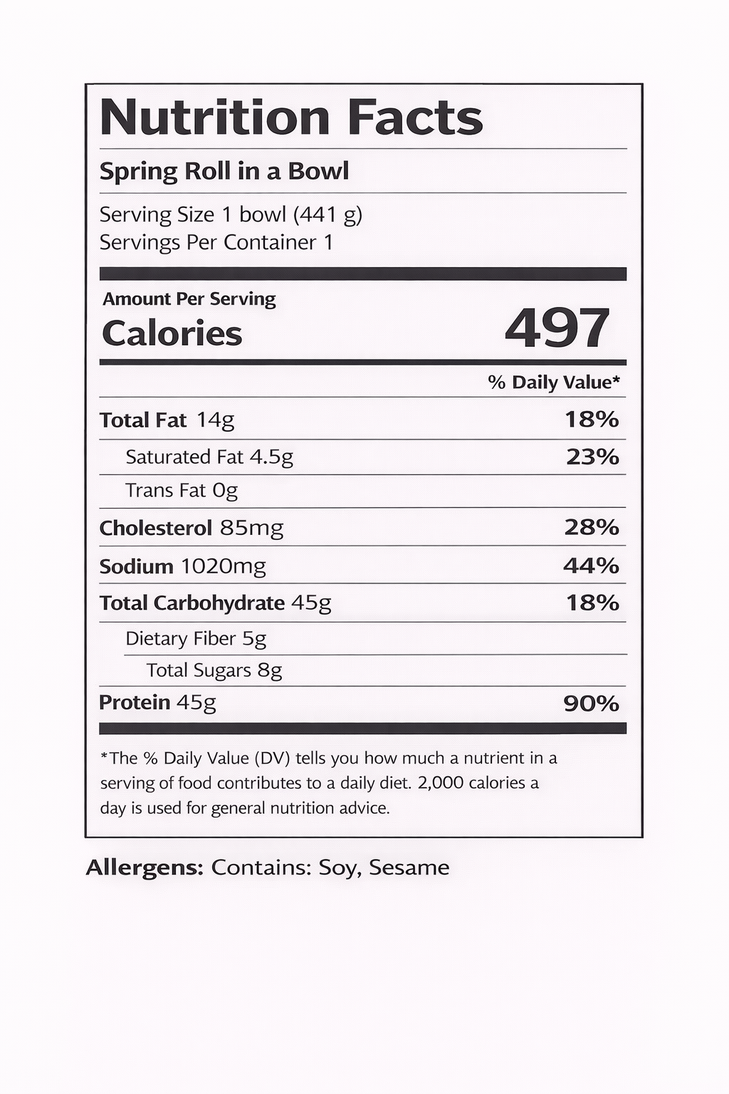 | Macros | Regular: 497 Calories, 49g Carbohydrates, 45g Protein, 14g Fat |