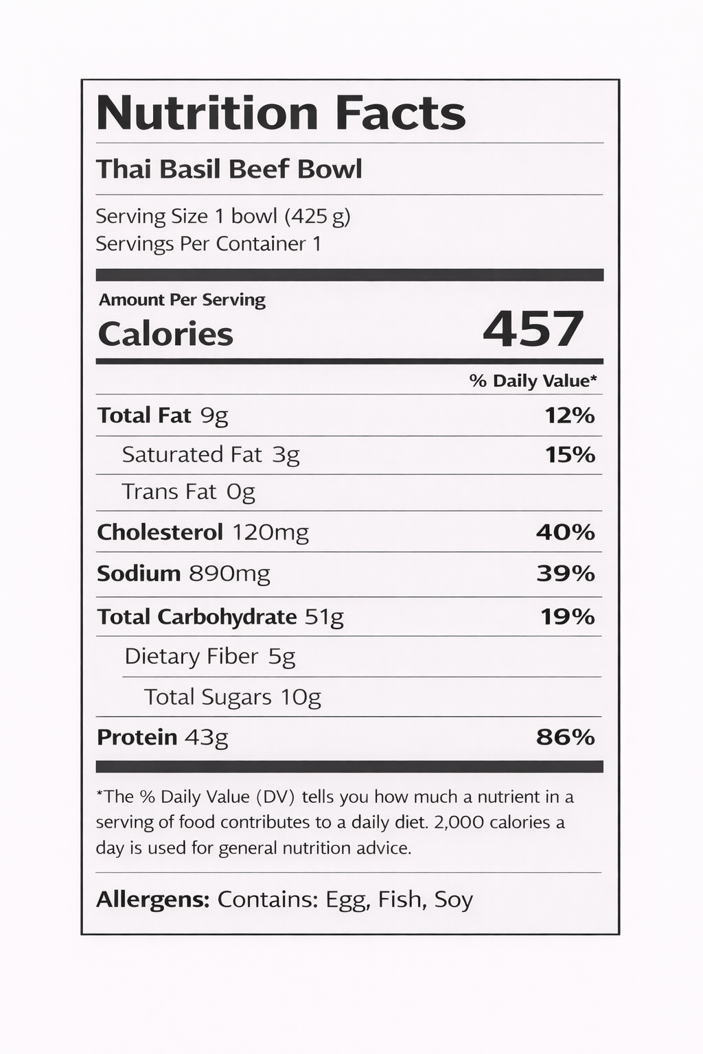 Extra Lean Ground Beef, Jasmine White Rice, Bell Peppers, Onions, Thai Basil, Carrots, Egg, Sesame Seeds, Signature Thai Basil Sauce (Contains: Soy Sauce, Oyster Sauce, Fish Sauce, Red Chilli, Green Onion, Garlic), Salt, Pepper
